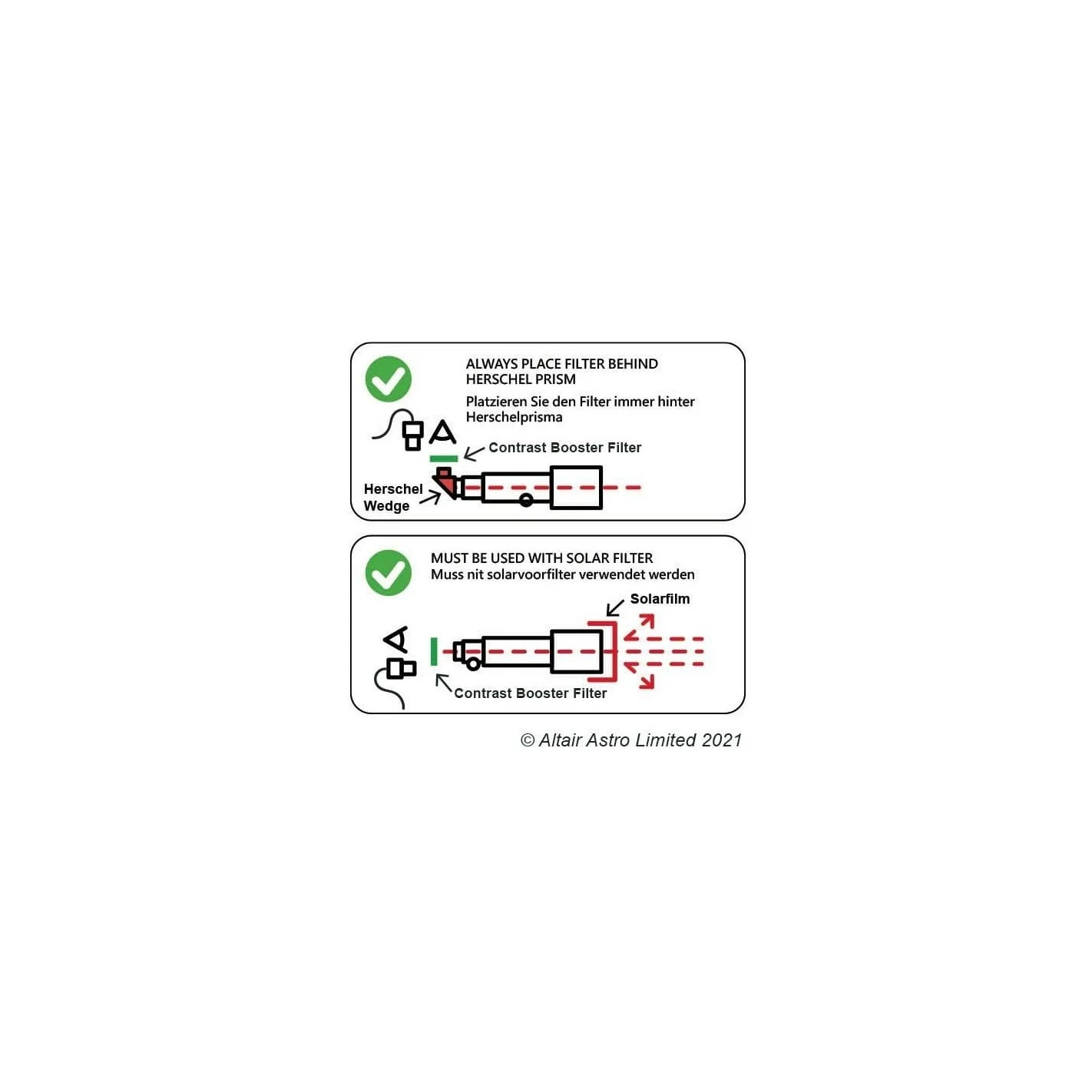 NOTA: No inserte el filtro antes de su Prisma Hershel o se derretirá, debe colocarse justo delante de la cámara, DESPUÉS DEL PRISMA HERSCHEL. Para una Hypercam puede utilizar un portafiltros magnético Altair con deslizador de filtro de 2» (busque el código de producto que empieza por “MAGF” y elija la rosca correcta para su cámara).