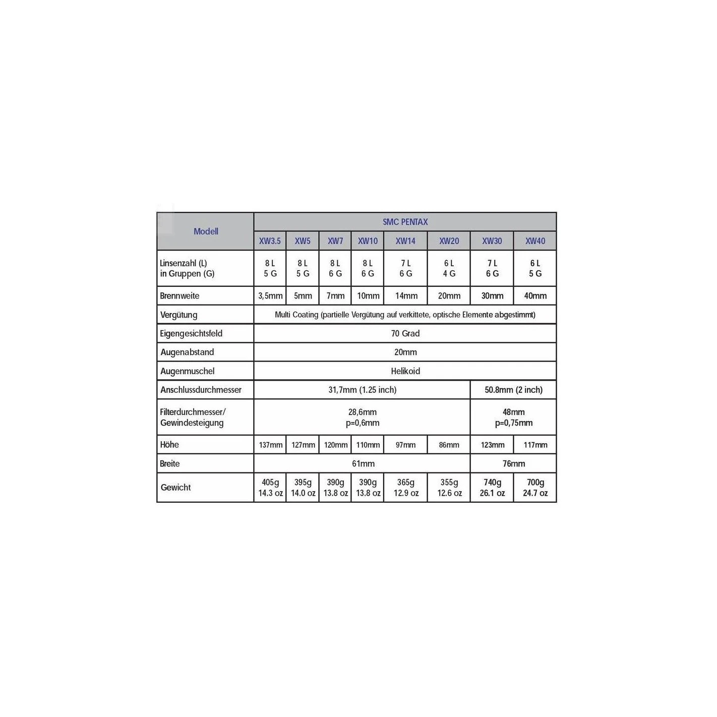 La serie XW cuenta con un amplio ángulo de visión aparente (70 grados), una construcción resistente a la intemperie JIS Clase 4 y un alivio ocular largo (20 mm). La óptica, que incorpora elementos de vidrio de lantano de baja dispersión y alta refracción y un revestimiento multicapa original de PENTAX, ofrece imágenes brillantes de alta resolución con aberraciones y distorsiones mínimas.