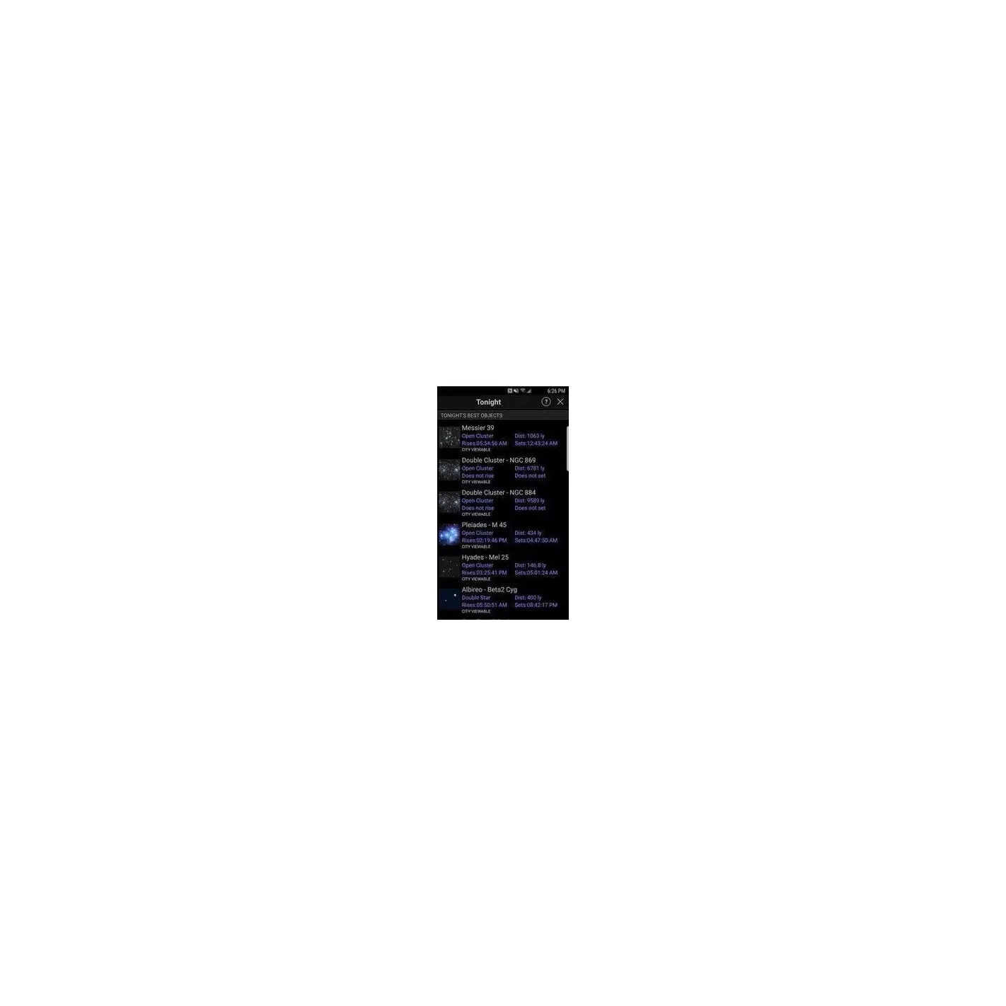 La aplicación StarsenseExplorer te permite seleccionar el objeto a observar entre la lista de los visibles. Luego te mostrará la dirección en la que tendrás que moverte para encontrarlo, haciendo zoom cada vez más, hasta que estés apuntando al objetivo. Ahora sólo tendrás que observarlo a través del ocular del telescopio. A diferencia de todos los sistemas disponibles en el mercado, incluidas las aplicaciones astronómicas, el sistema patentado StarsenseExplorer RECONOCE AUTOMÁTICAMENTE, a través de las estrellas más brillantes, la posición exacta del telescopio en el cielo.