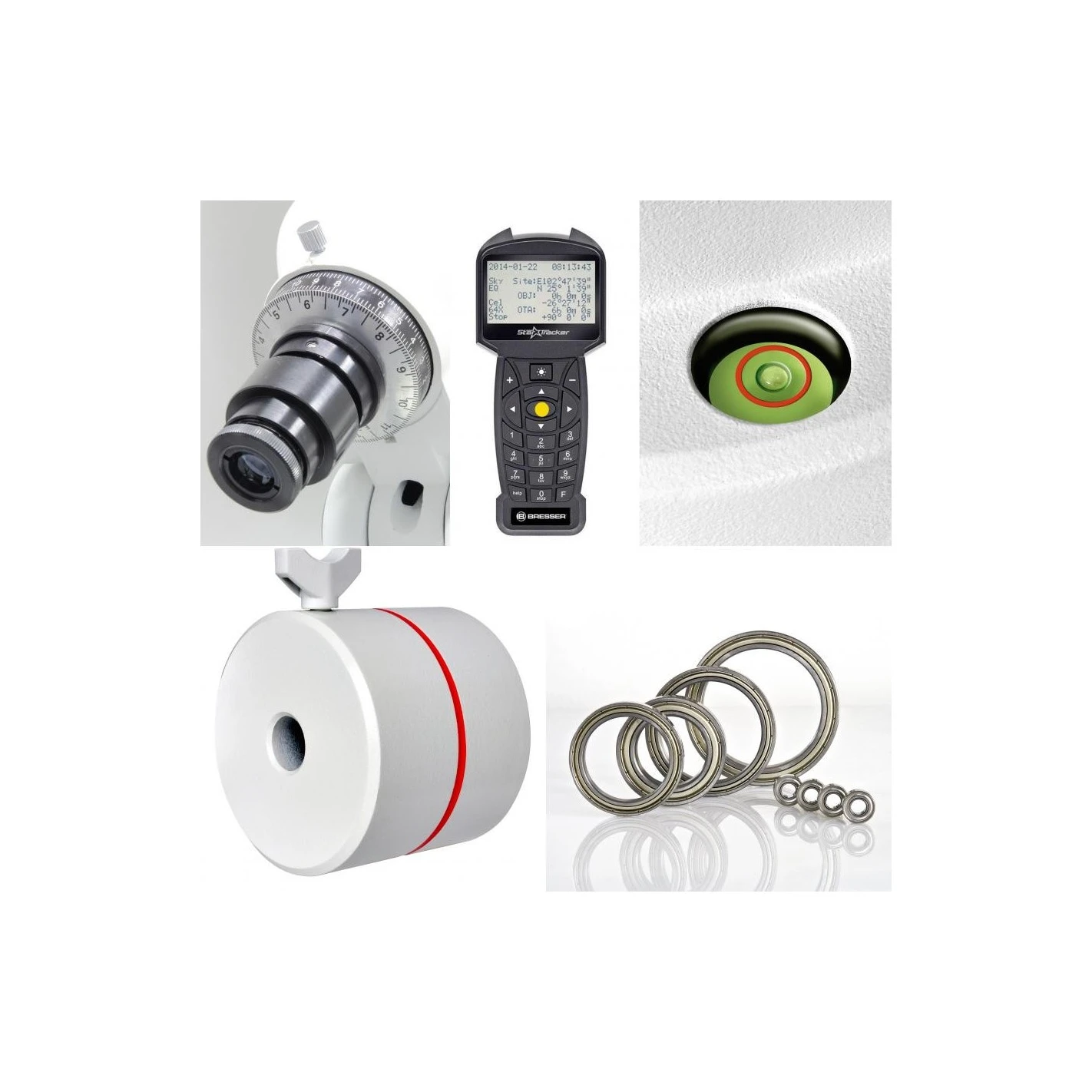 - Cojinetes de bolas en ambos ejes AR y DEC para seguimiento suave y preciso.