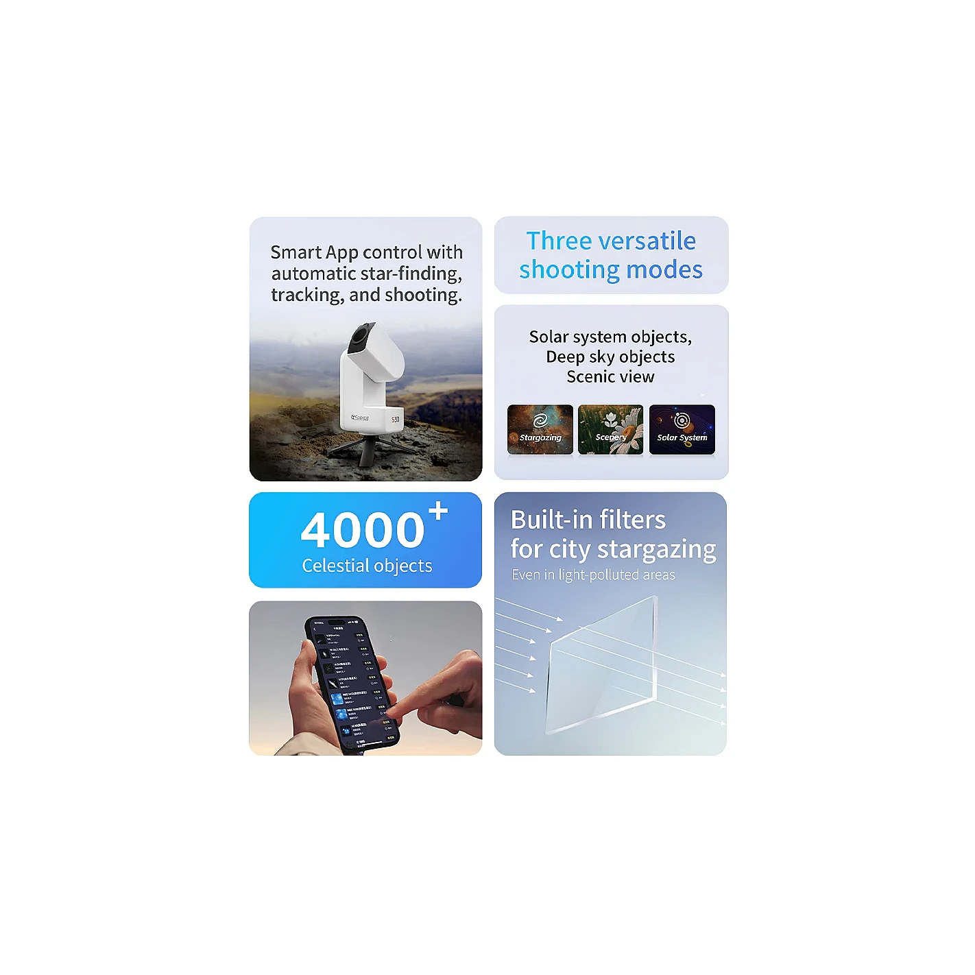 La aplicación inteligente Seestar le permite explorar el sistema solar, observar las estrellas o disfrutar de vistas panorámicas. Con múltiples modos de imagen, indicaciones de voz y un control perfecto del smartphone, Seestar S30 transforma a los principiantes en profesionales de la astronomía con facilidad.