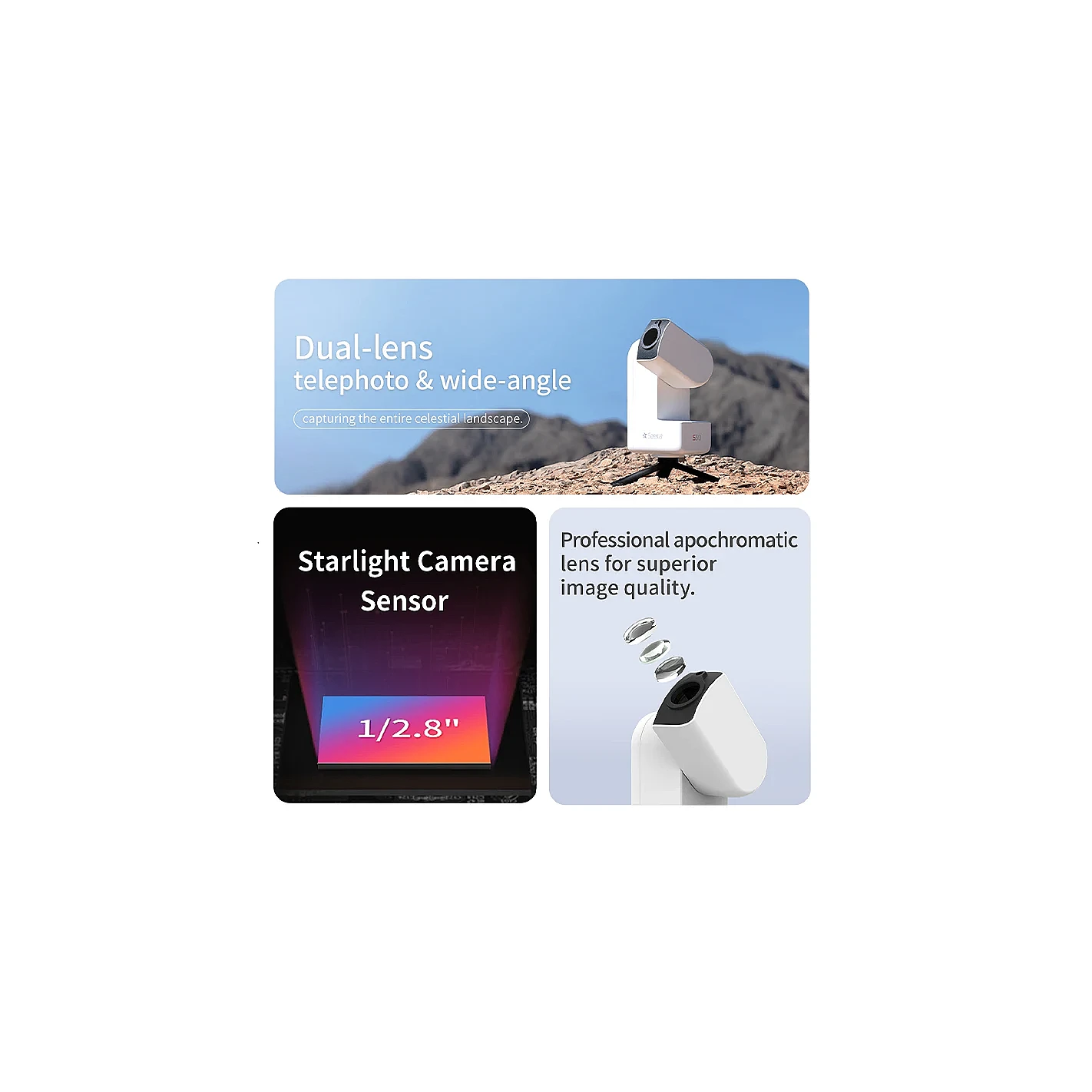 Con un diseño de lente apocromática de 30 mm que incluye cristal ED(Extra-baja Dispersión), meticulosamente optimizado por expertos ópticos, Seestar S30 asegura que cada estrella sea capturada con increíble detalle.