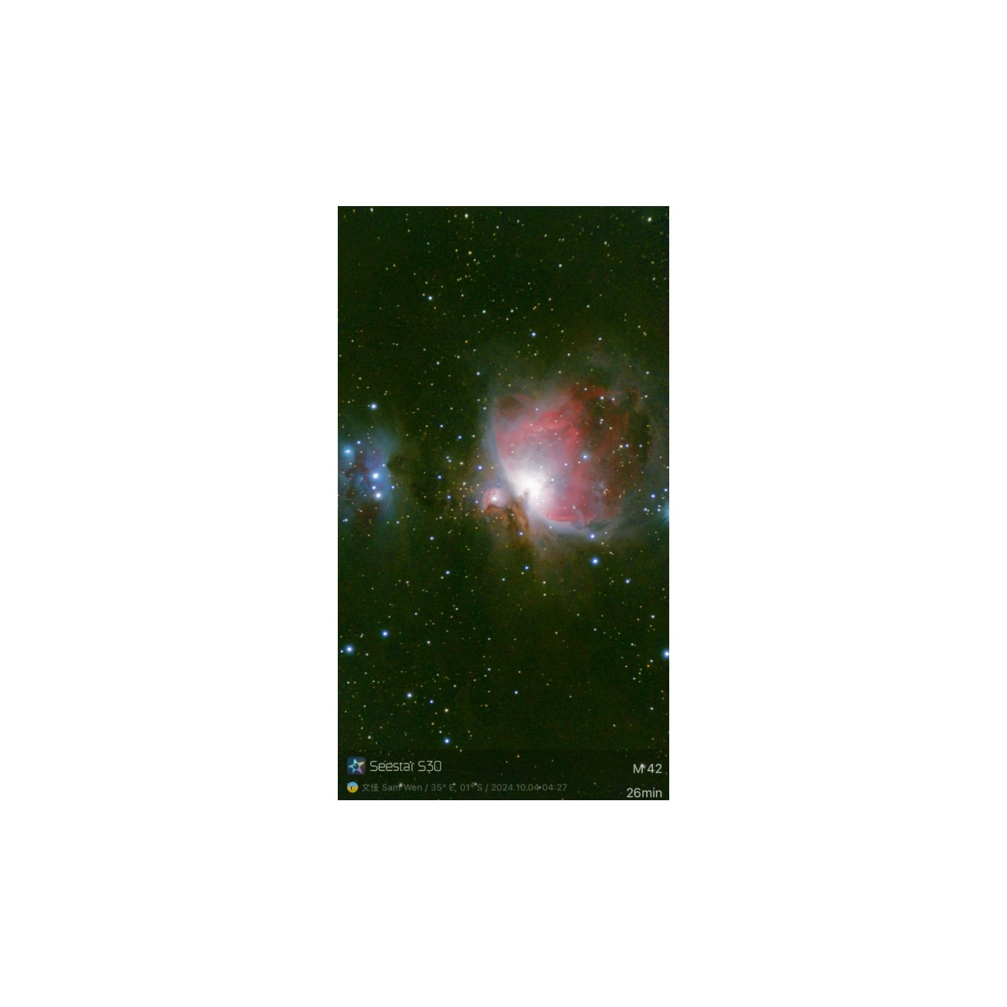Presentamos el Seestar S30: el mejor telescopio de viaje, pequeño pero potente. Gracias a su excepcional diseño óptico APO, puede incluso resolver el cúmulo del Trapecio en el núcleo de la nebulosa de Orión (M42) con un campo de visión relativamente amplio. ¡Listo para comenzar!