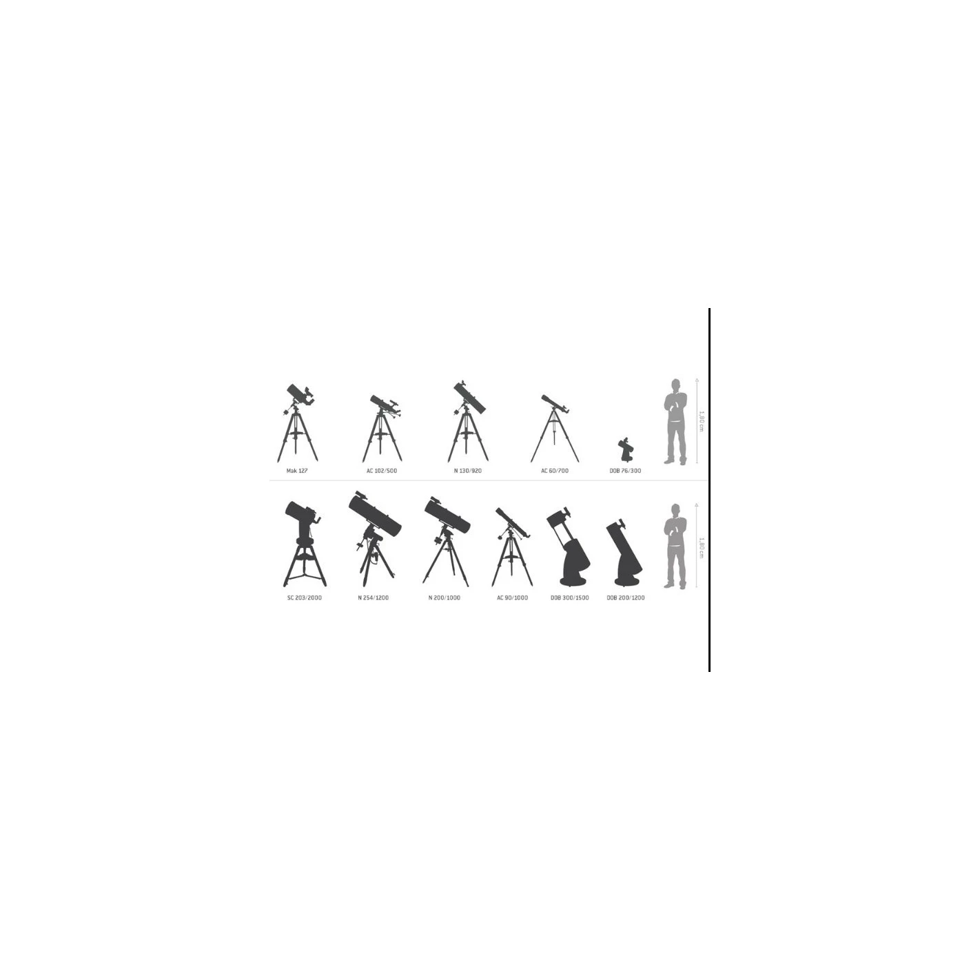 La relación de apetura «rápida» de 1:5 concede al telescopio gran potencial luminosa que muestra muchos detalles de los objetos observados. Supera unos 600 veces la capacidad del ojo humano. Los centros de cúmulos globulares com M13 o M92 pueden observarse con gran resolución. Muchas galaxias pueden observerse; nebulosas de emisión como Omega o Orión revelan filamentos y, gracias a este telescopio, se presentan como objetos astronómicos impresionantes tanto en verano como en invierno. Hasta planetas muestran muchos detalles de su naturaleza real. Por ejemplo puede observar las nubes del Júpiter y seguir la Gran Mancha Roja en su camino sobre el planete. Con una apertura de 150mm incluso capta la sombra que los grandes satélites dibujan en el Júpiter. Además, ofrece la posibilidad de familiarizarse con la astrofotografía y sacar p. ej. fotos de la luna. Si busca un telescopio tanto potente como compacto, aquí encuentra la opción ideal.